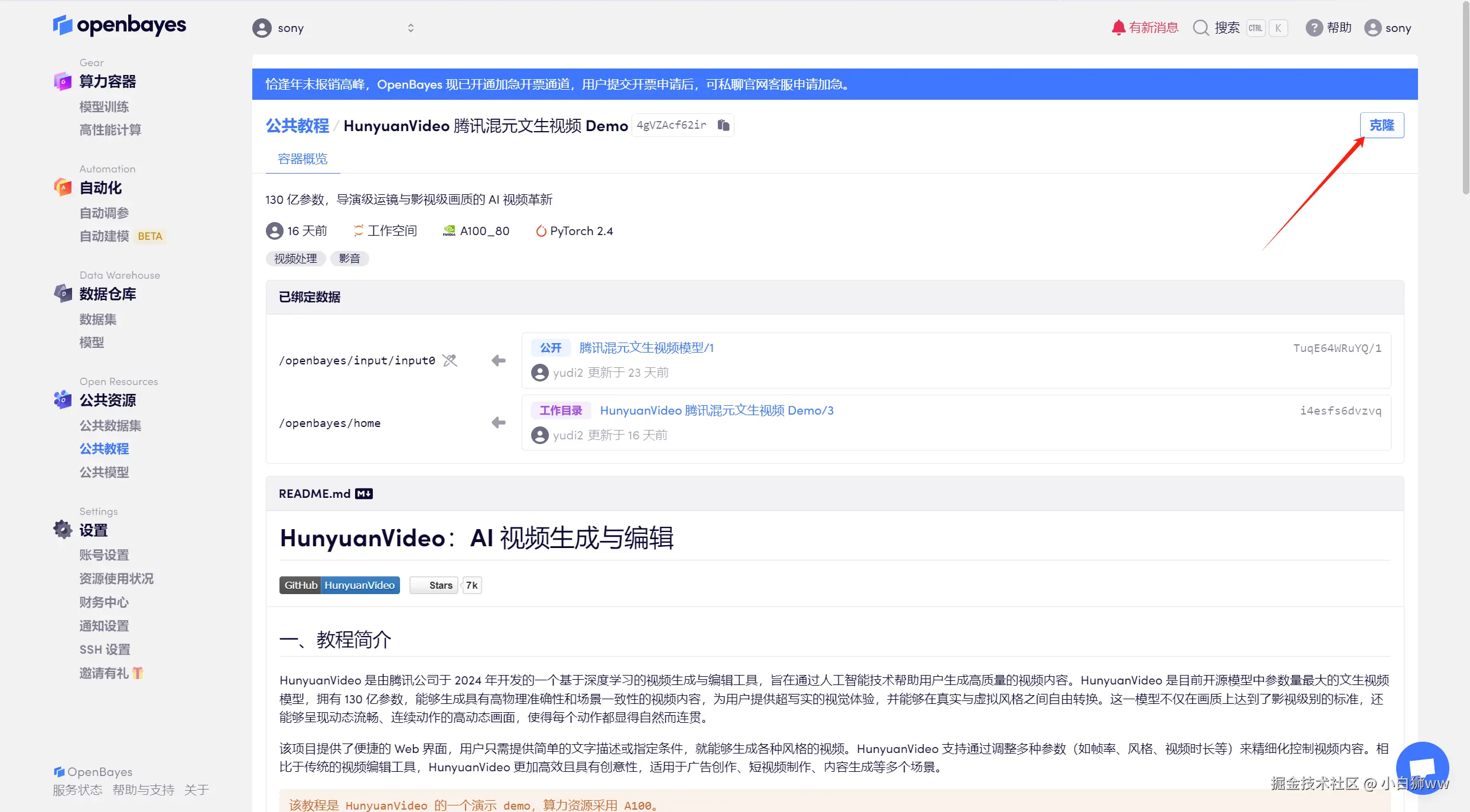 登录 OpenBayes.com,在「公共教程」页面,选择「HunyuanVideo 腾讯混元文生视频 Demo」教程。