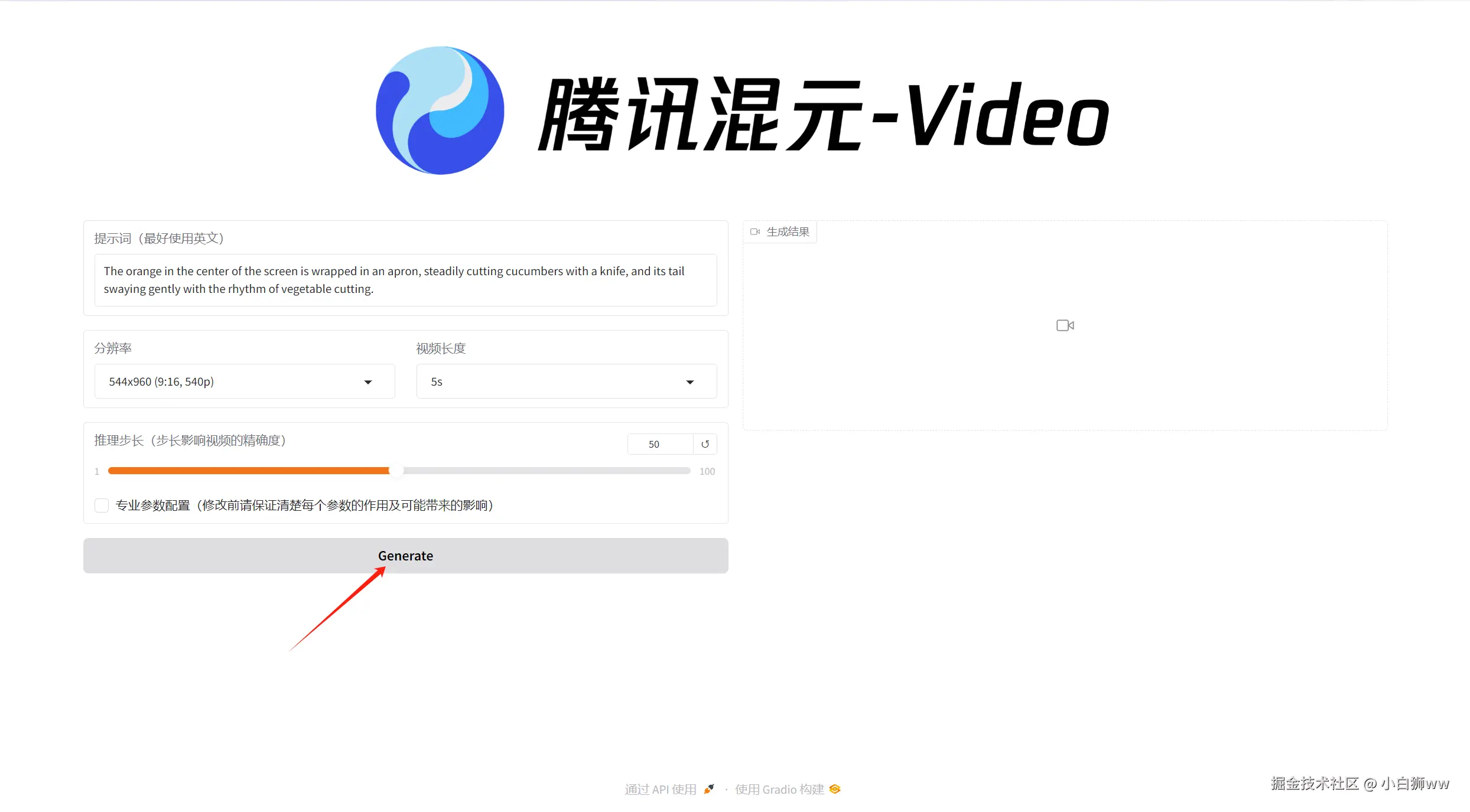 进入模型后,输入生成视频的提示词(The orange in the center of the screen is wrapped in an apron, steadily cutting cucumbers with a knife, and its tail swaying gently with the rhythm of vegetable cutting.),按照需求设置分辨率和视频长度。「推理步长」影响视频的精度,推理步长越长生成的视频精度越高。最后点击「Generate」生成。