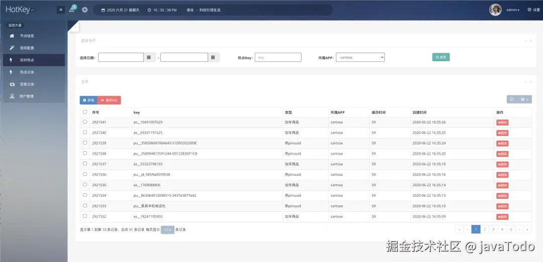 - dashboard 控制台:控制台是一个带可视化界面的 Java 程序,也是连接到 etcd,之后在控制台设置各个 APP 的 key 规则,譬如 2 秒出现 20 次算热 key。然后当 worker 探测出来热 key 后,会将 key 发往 etcd,dashboard 也会监听热 key 信息,进行入库保存记录。同时,dashboard 也可以手工添加、删除热 key,供各个 client 端监听。