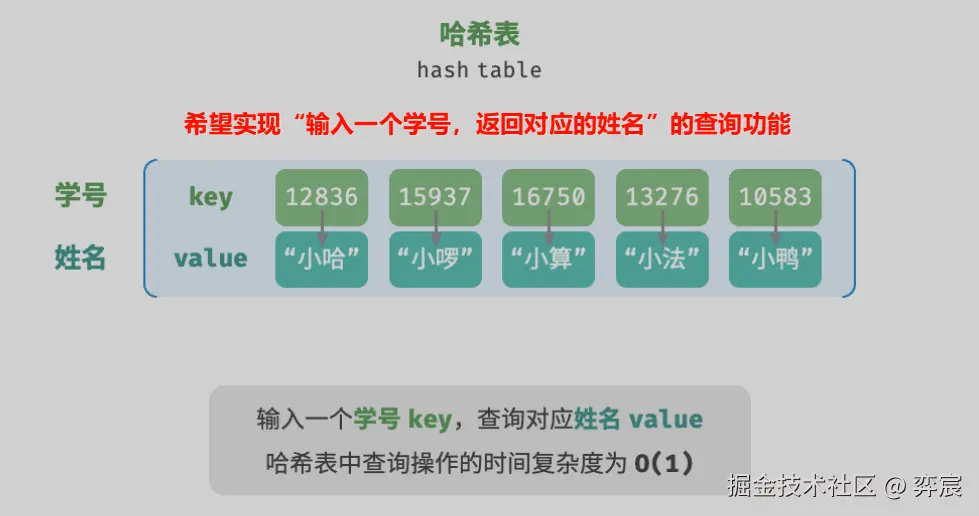 哈希表又称散列表,通过建立键 key 与值 value 之间的映射,实现高效的元素查询。当对哈希表输入键 key 时,即可查询到对应的值 value,其时间复杂度仅为 O(1)。