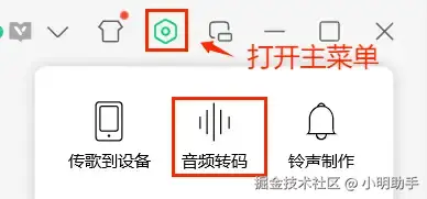 第一步:启动QQ音乐,打开界面右上方的【主菜单】,选择【音频转码】。