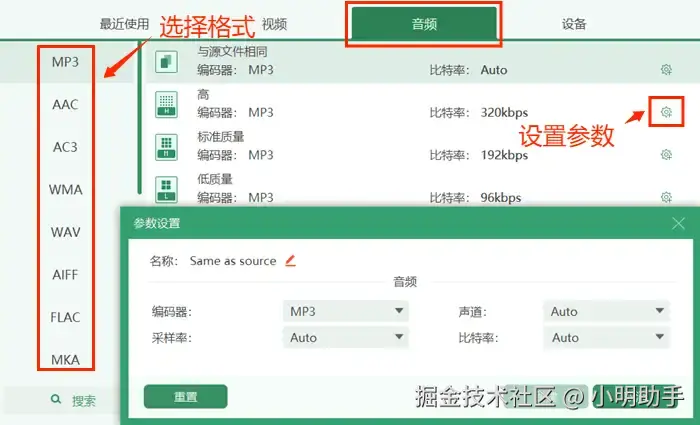 第三步:点击输出格式选择界面上方的【音频】按钮,从左侧的格式选择栏中寻找并选择自己需要的音频格式。还可以点击界面右侧的小齿轮按钮进行参数设置。