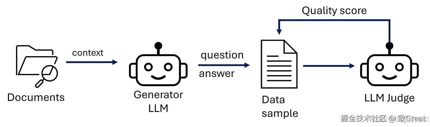 我们加载文档并将上下文传递给生成器 LLM,生成器会生成问题和答案。问题、答案和上下文是传递给 LLM 评委的一个数据样本。然后,LLM 评委会生成质量分数,该分数可用于过滤掉不良样本。 自动从文档生成 RAG 评估数据样本的工作流程。图片由作者提供 自动生成 RAG 数据集的基本工作流程从从文档(例如 PDF 文件)读取我们的知识库开始。