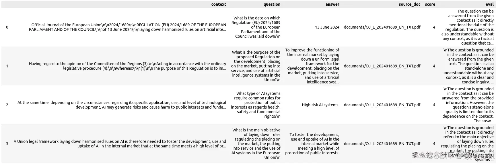 以下是我们最终的 RAG 评估数据集(以 Pandas DataFrame 格式):