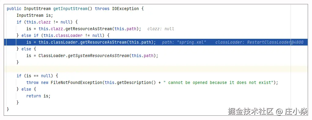 所以,最终我们在所有的目录中都找不到spring.xml,并且会报错提示加载不了文件。报错的地方位于 ServletContextResource#getInputStream 中: