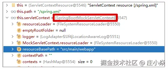 很明显,我们一般都不会使用本案例的方式(即locations = {“spring.xml”},无任何“前缀”的方式),毕竟它已经依赖于使用的 ApplicationContext。而 classPath 更为普适些,而一旦你按上述方式修正后,你会发现它加载的资源已经不再是 ServletContextResource,而是和应用程序一样的 ClassPathResource,这样自然可以加载到了。
