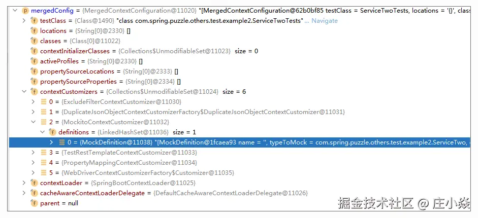 很明显,MergedContextConfiguration(即 Context Cache 的 Key)的 ContextCustomizer 是不同的,所以 Context 没有共享起来。而追溯到 ContextCustomizer 的创建,我们可以具体来看下。