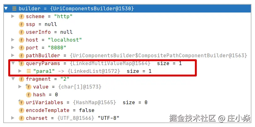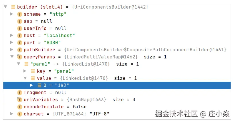 可以看出,参数 para1 对应的值变成了我们期待的”1#2”。如果你想了解更多的话,还可以参考 UriComponentsBuilder#fromHttpUrl,并与之前使用的 UriComponentsBuilder#fromUriString 进行比较: