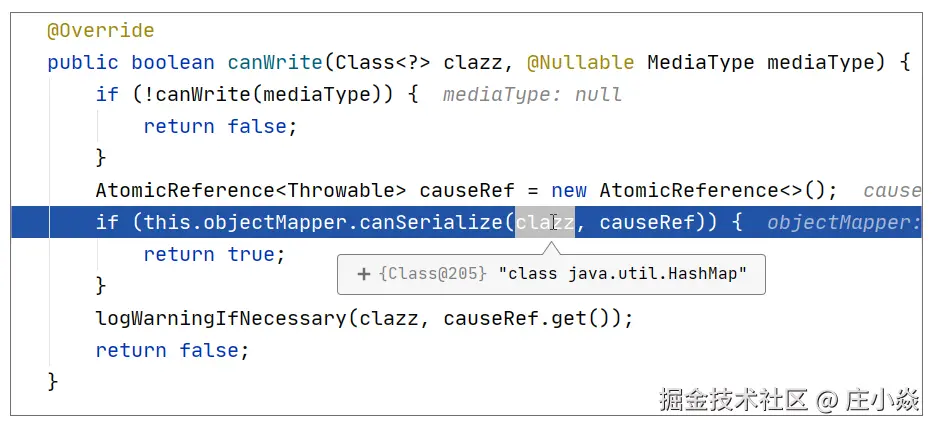 上述代码看起来比较复杂,实际上功能很简单:根据当前要提交的 Body 内容,遍历当前支持的所有编解码器,如果找到合适的编解码器,就使用它来完成 Body 的转化。这里我们不妨看下 JSON 的编解码器对是否合适的判断,参考 AbstractJackson2HttpMessageConverter#canWrite: