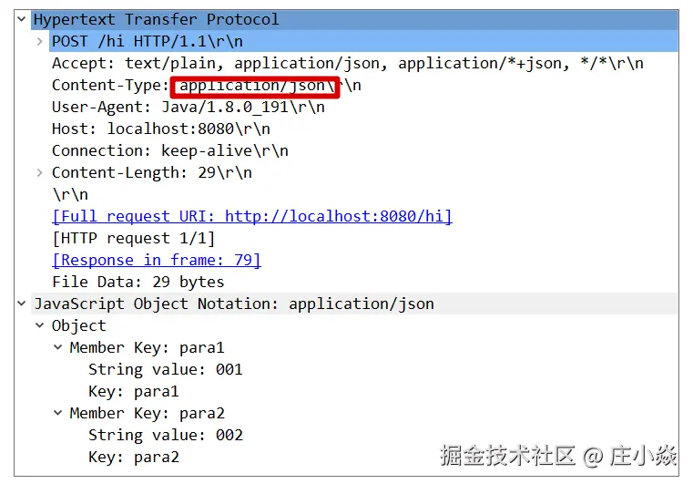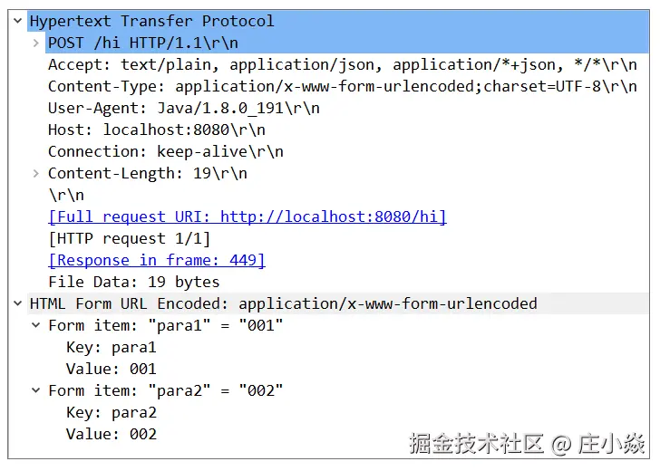 在具体解析这个问题之前,我们先来直观地了解下,当我们使用上述的 RestTemplate 提交表单,最后的提交请求长什么样?这里我使用 Wireshark 抓包工具直接给你抓取出来: