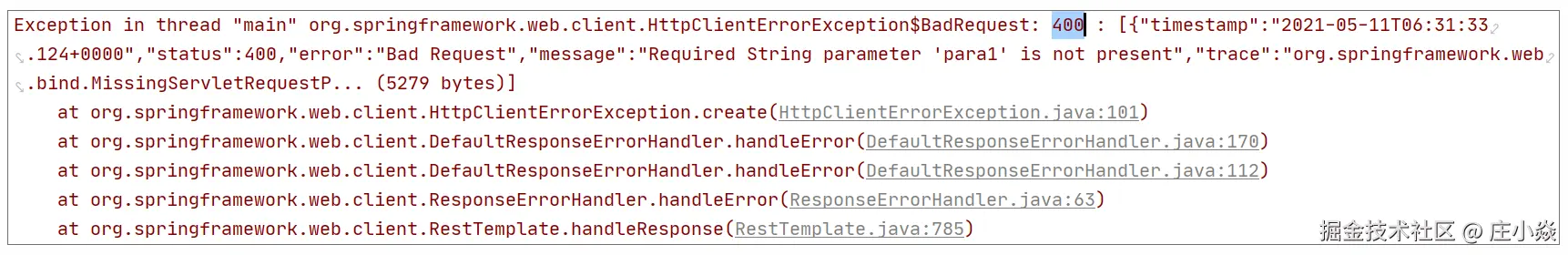 上述代码定义了一个 Map,包含了 2 个表单参数,然后使用 RestTemplate 的 postForObject 提交这个表单。测试后你会发现事与愿违,返回提示 400 错误,即请求出错:
