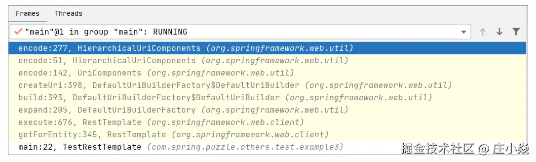 \ 从上图可以看出,我们实际上是将定义的表单数据以 JSON 请求体(Body)的形式提交过去了,所以我们的接口处理自然取不到任何表单参数。那么为什么会以 JSON 请求体来提交数据呢?这里我们不妨扫一眼 RestTemplate 中执行上述代码时的关键几处代码调用。