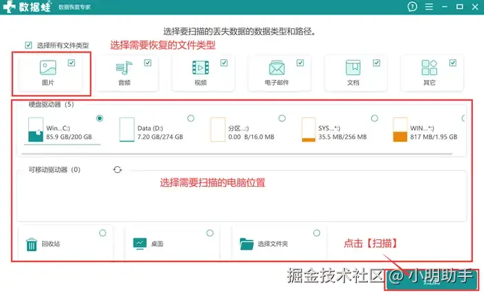 步骤1: 在电脑打开数据 蛙恢复专家,然后进入软件首页,选择好需要恢复的数据类型(照片的话勾选【图片】即可)后选择软件要进行扫描的电脑位置(即照片误删的位置),最后点【扫描】,启动软件开始扫描;