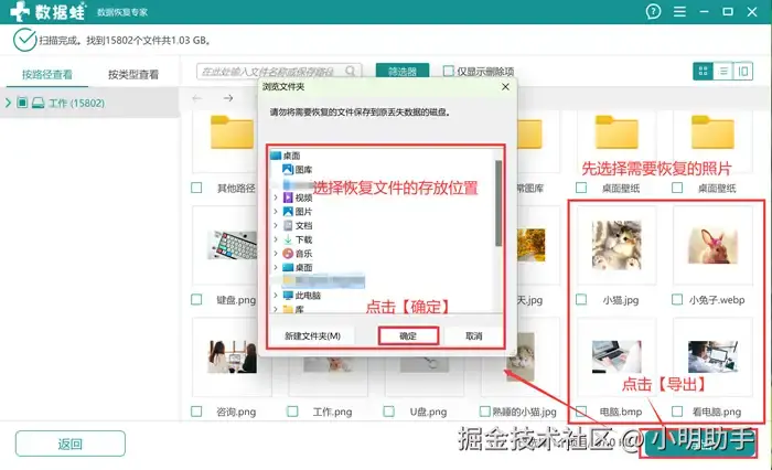 步骤2: 等待扫描结束后,选择需要恢复的照片(照片提供预览功能)后,点击【导出】;最后在【浏览文件夹】中选择自己需要存放的另一个电脑位置即可。(千万不能放到原位置上)