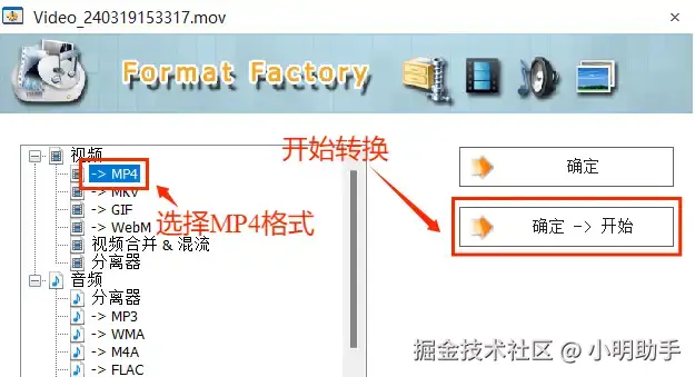 第二步:点击选择【MP4】格式,然后选择【确定->开始】按钮开始转换mov格式。