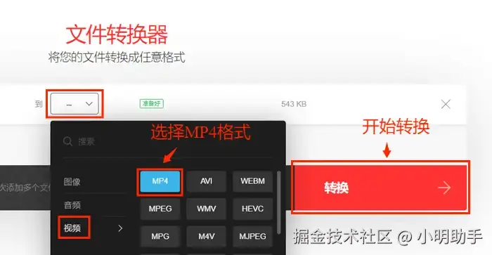 第三步:点击【···】按钮,在【视频】列表中选择MP4格式,然后点击【转换】按钮开始转换视频格式。