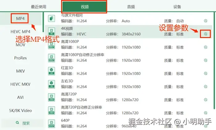 第三步:点击弹出界面上方的【视频】按钮,选择MP4格式。如果有需要的话,可以点击小齿轮按钮设置比特率等参数,设置完毕选择新建的格式。
