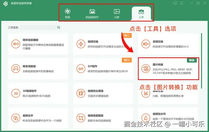 步骤1:打开数据 蛙视频转换器,点击【工具】选项,选择该选项下的【图片转换】功能。