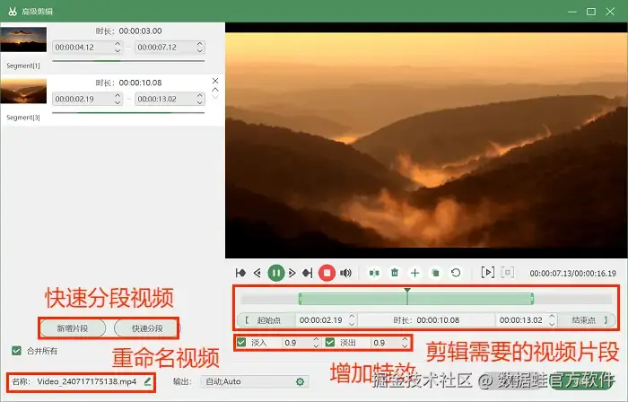 步骤3:录制完成后在多媒体窗口进行查看和编辑。可以选择“高级剪辑”快速分段视频、增加特效、重命名视频等。