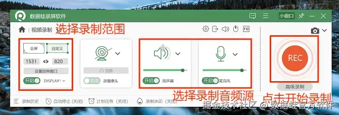 步骤2:设置相关参数,如录制范围、音频来源等。设置完毕后点击“REC”按钮开始录制。