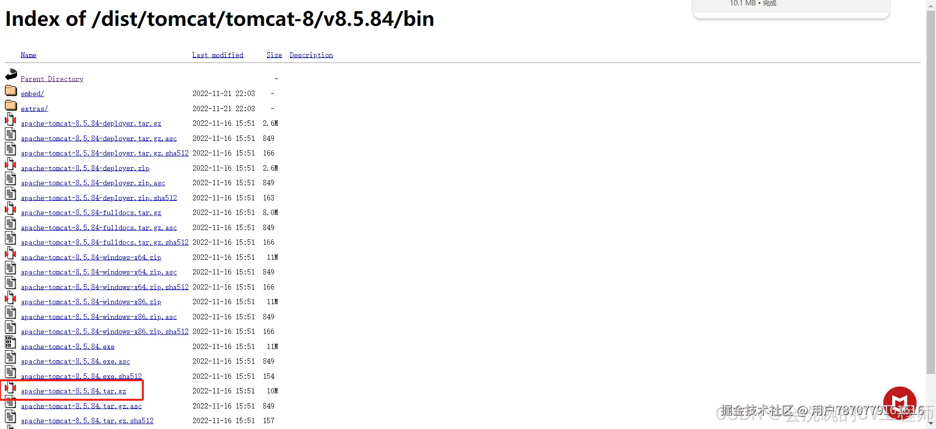 tomcat历史版本大家我可以点击查看自己要tomcat的历史版本,我这里安装tomcat8.5.84版本作为展示,直接进入bin目录找到tar.gz压缩包即可