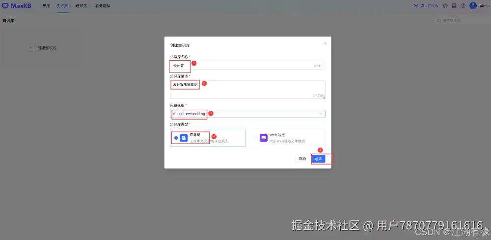 输入知识库名称、知识库描述、选择通用型知识库类型。 根据如下图所示,自定义填写即可。