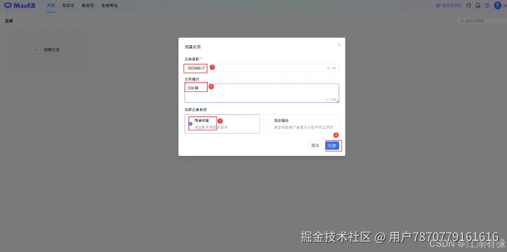 点击【创建应用】,输入应用名称,选择【简易配置应用】,点击【创建】。