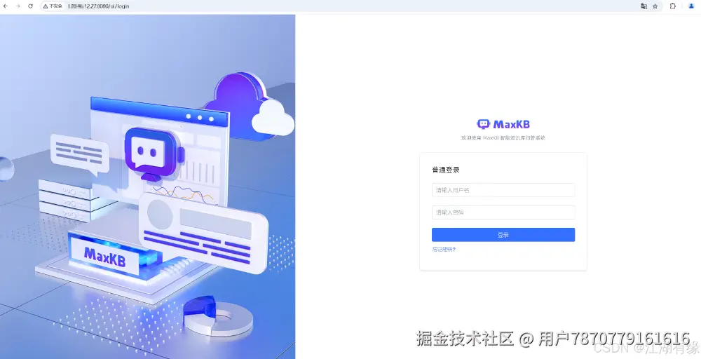 浏览器访问地址:http://服务器IP地址:8080,将IP替换为自己云服务器弹性公网IP地址。浏览器打开后,进入MaxKB登录页。