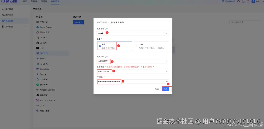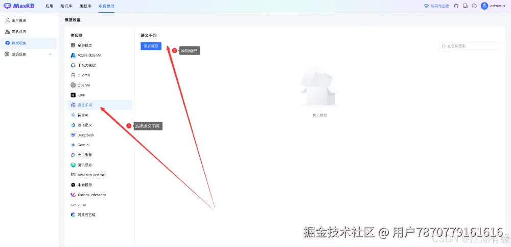 在模型设置的供应商列表中,我们选择通义千问,点击“添加模型”。