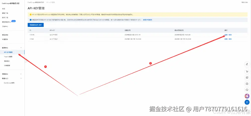 我们此次选择的供应商为义千问大模型,登录其官网。在DashScope灵积模型服务控制台->API Key管理中获取。