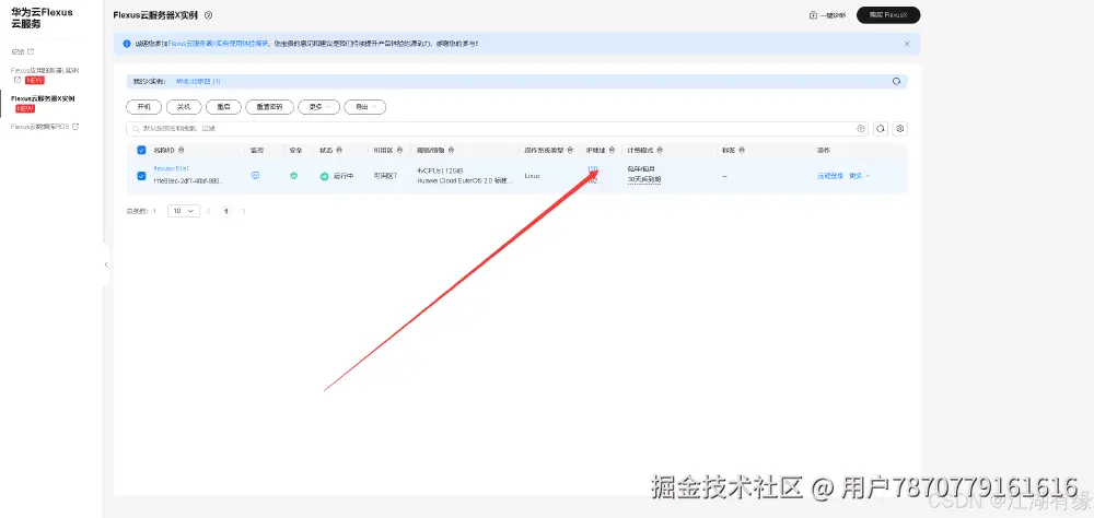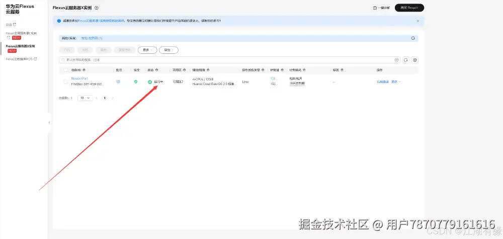 进入华为云Flexus云服务的控制台,选择Flexus云服务器X实例,可以看到已经正在运行的Flexus云服务器X实例。