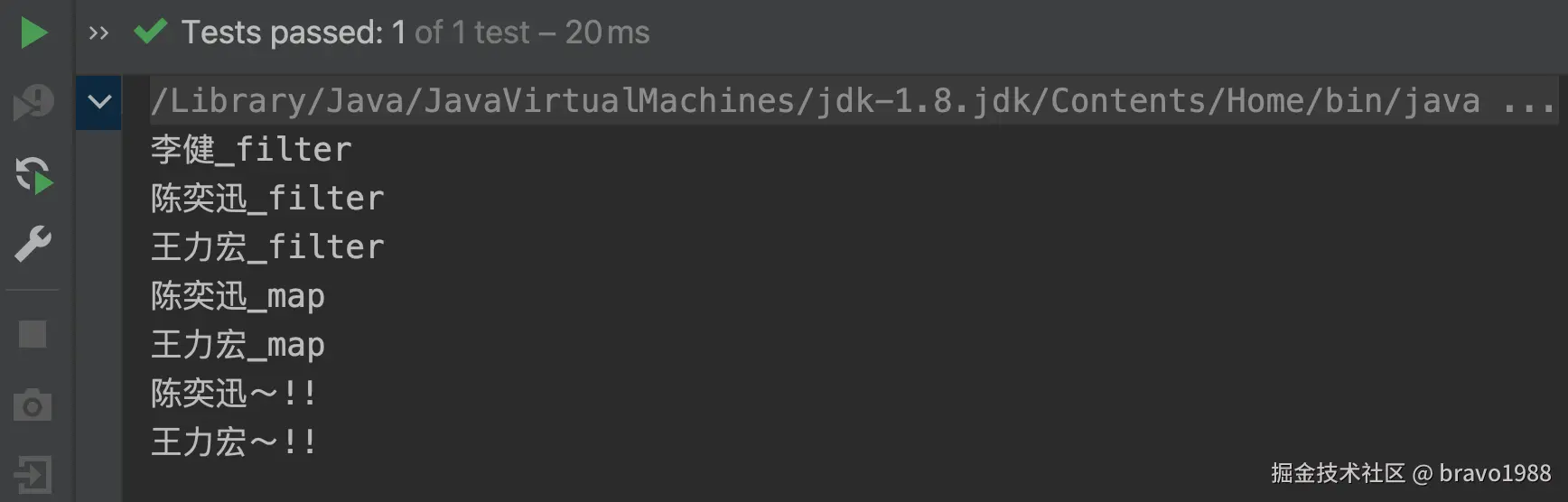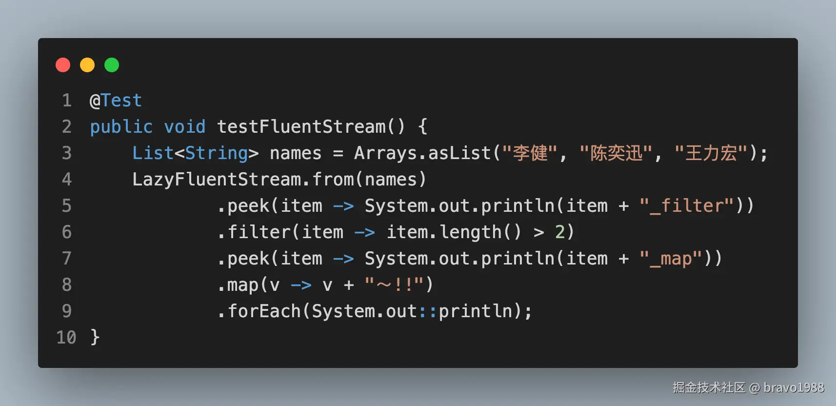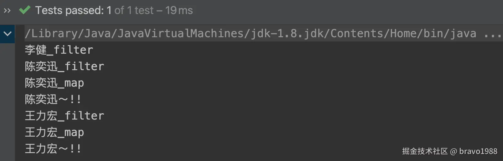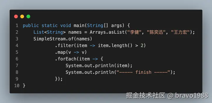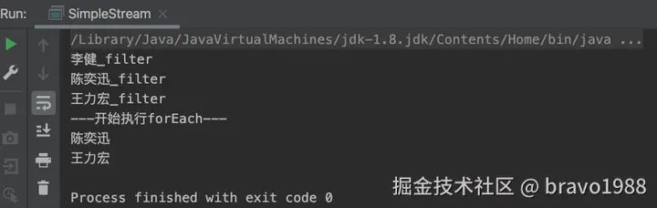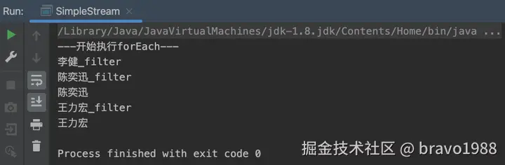 很简单,应该都能看懂。然后给上面的Stream写一个测试(故意把filter和forEach拆成两段代码):