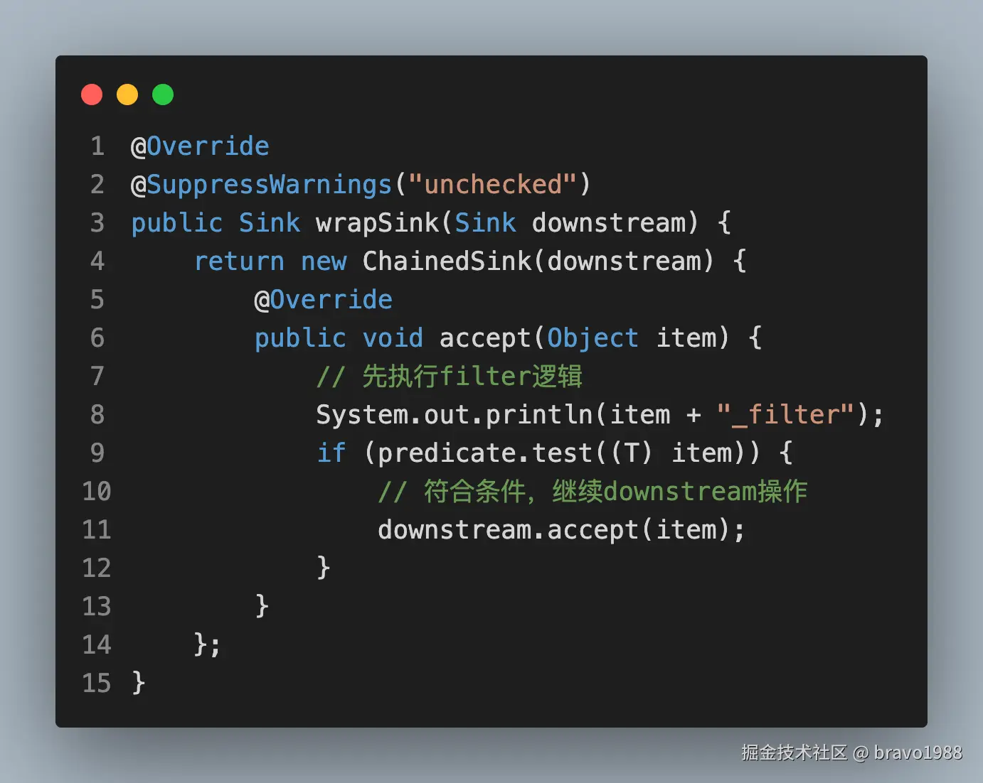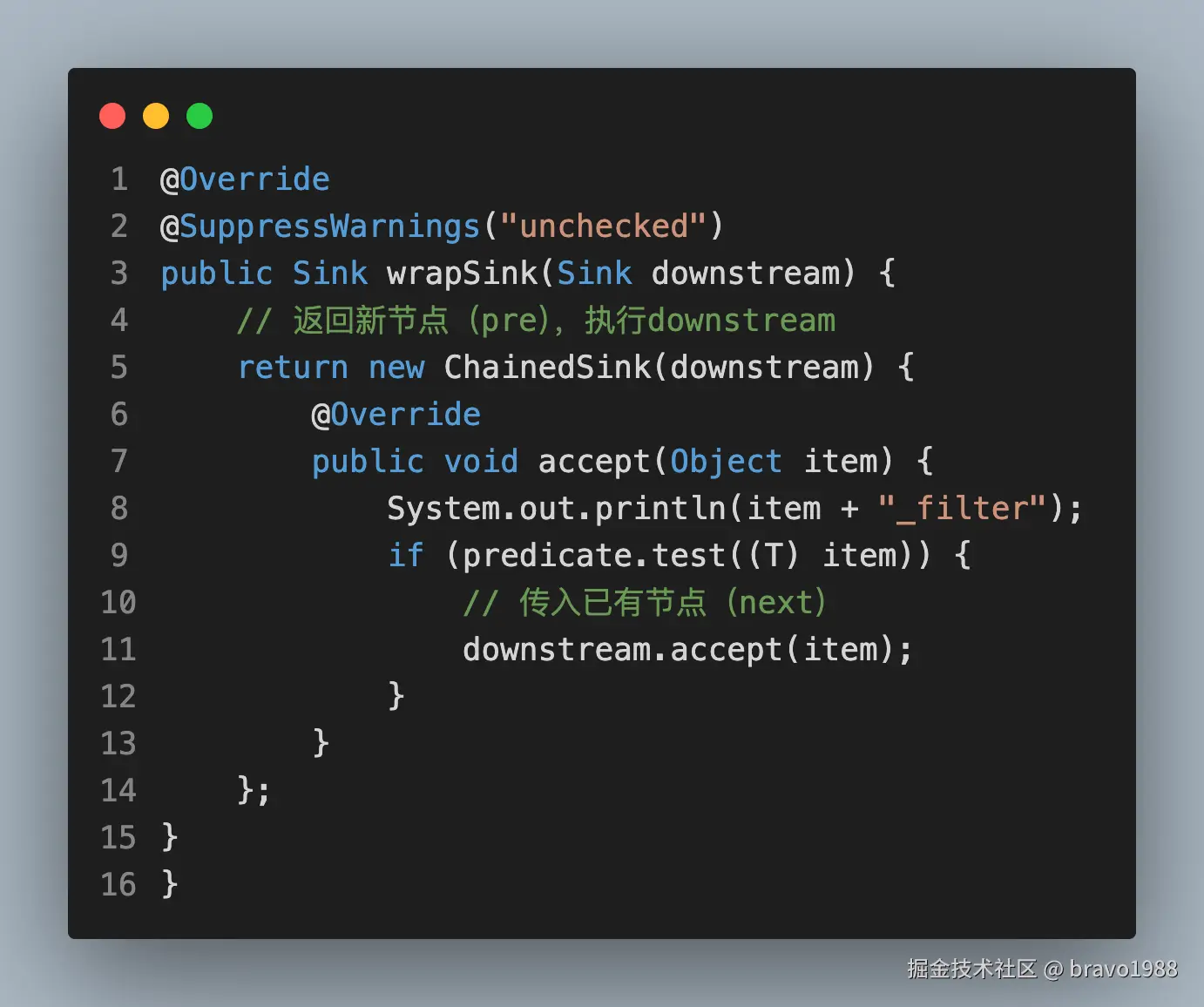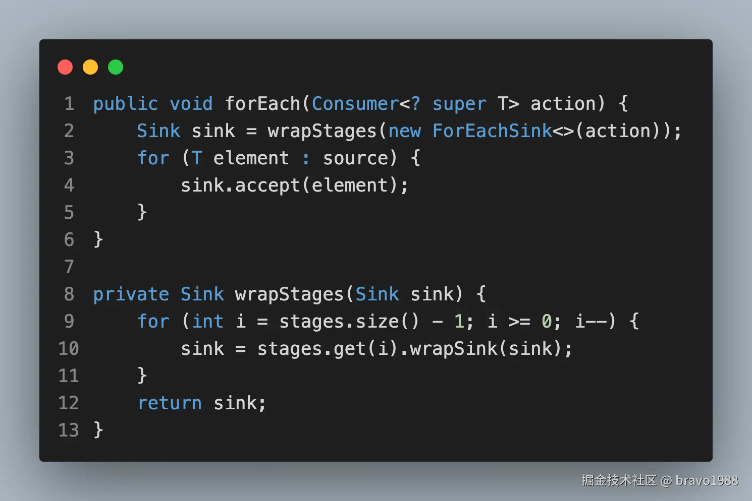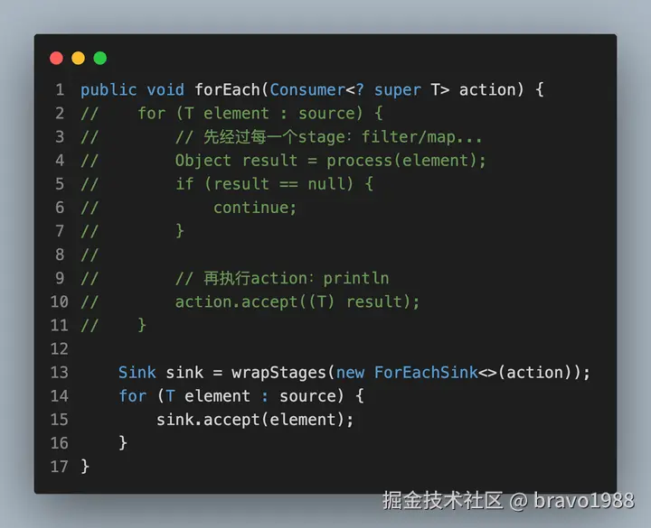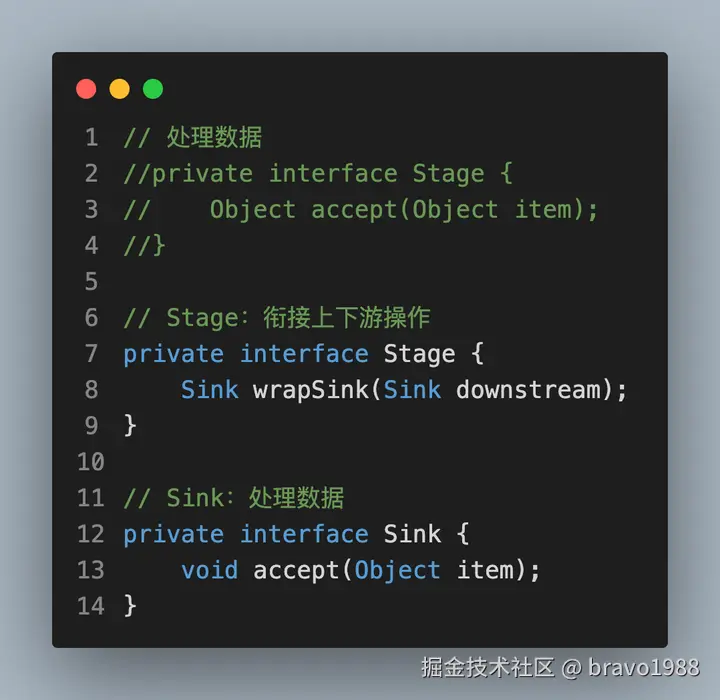 先别管Sink是什么,你可以把它看作另一种Stage,也是对中间操作的封装。总之,通过wrapStages(),我们得到了一种链式结构,这条链上有我们通过filter()、map()等方法压入的中间操作,只要调用 sink.accept(element) ,element就会沿着链条执行下去,就像往下水道倒了一碗水。
