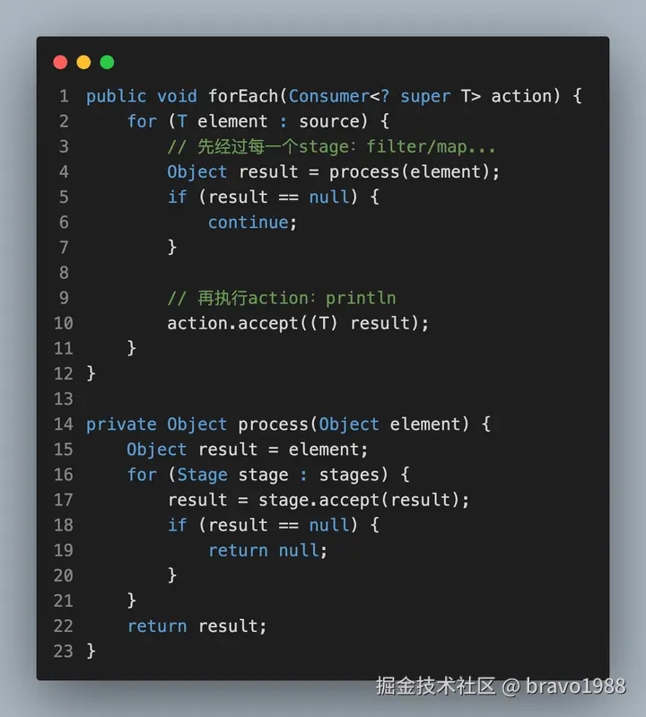 为了稍微接近Java 8的 Stream API,这里再做一次迭代:优化forEach中的process。