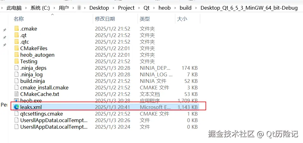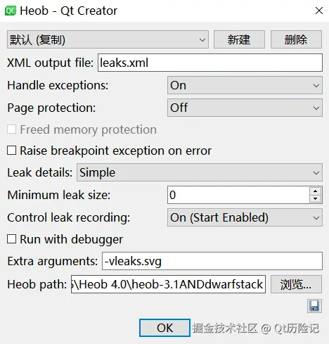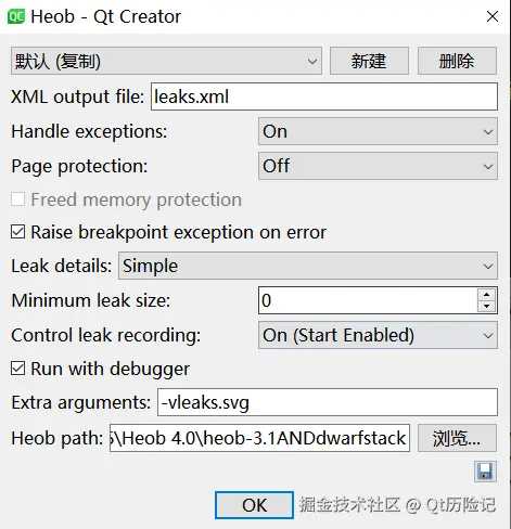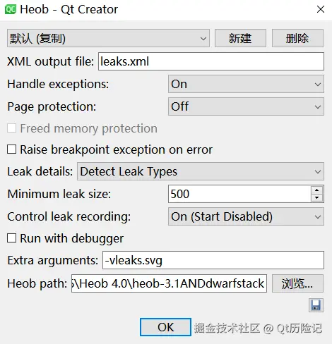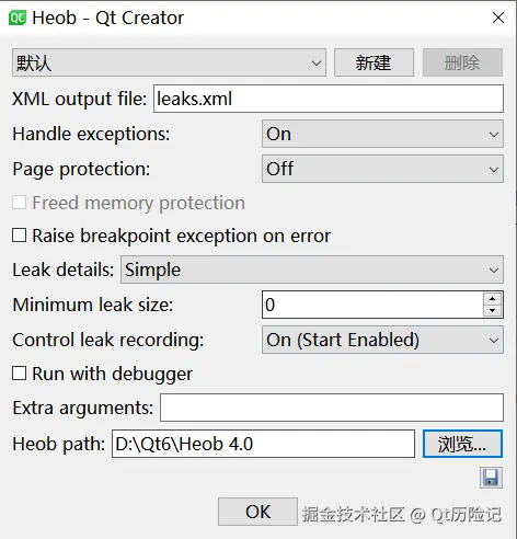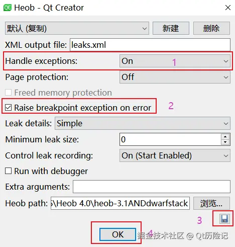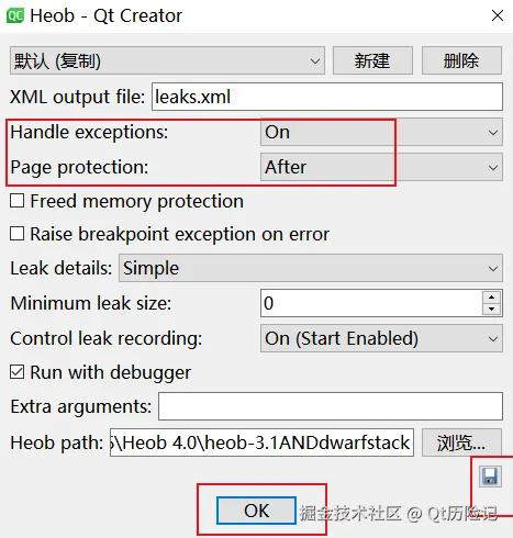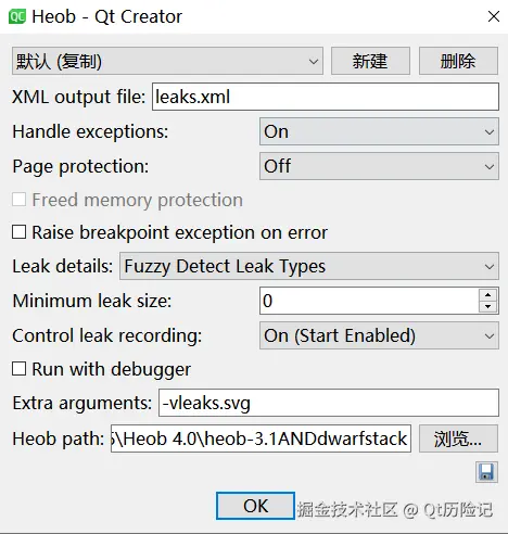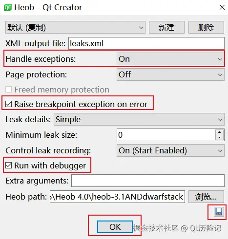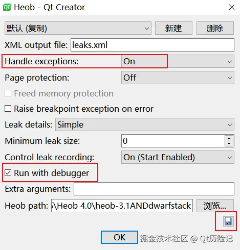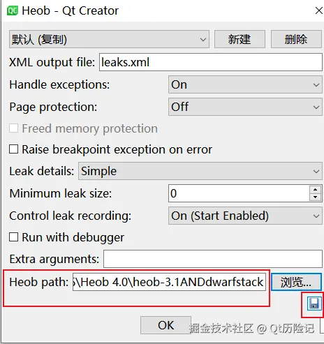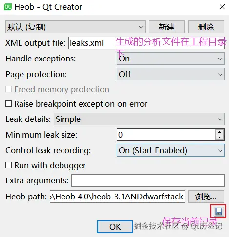 点击右下角软盘图标可以保存配置,配置文件保存在QtProject\leaks.xml文件中;