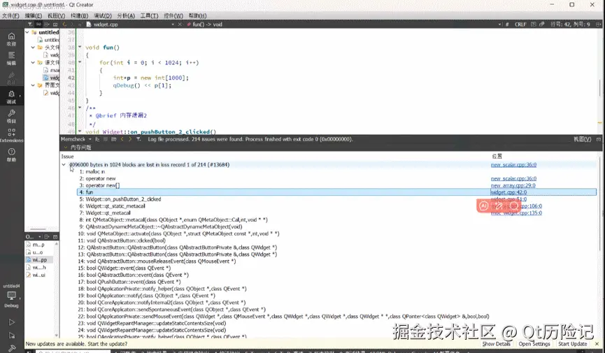 当程序运行后分别点击【泄漏1】【泄漏2】按键,然后退出程序,程序退出后会将分析结果生成位leaks.xml文件,并在调试窗口显示检测到的内存泄漏;