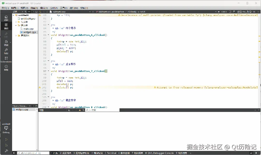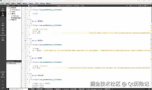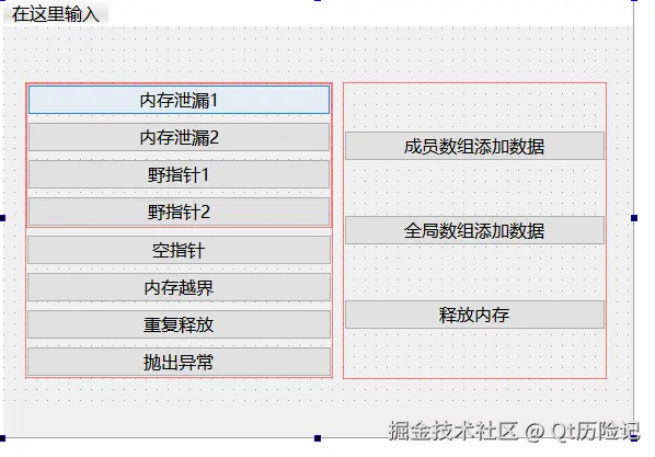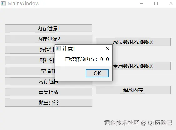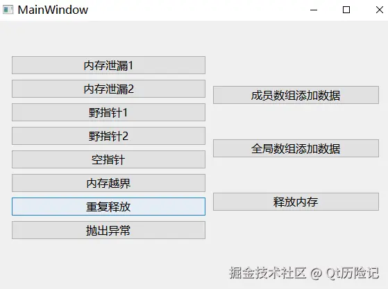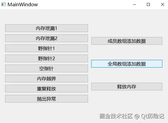 #include "mainwindow.h"#include "ui_mainwindow.h"#include <QDebug>#include <QMessageBox>MainWindow::MainWindow(QWidget *parent) : QMainWindow(parent) , ui(new Ui::MainWindow){ ui->setupUi(this);}MainWindow::~MainWindow(){ delete ui;}class Test{public: Test() { p = new int; }private: int* p;};/** * @brief 内存泄漏1 */void MainWindow::on_pushButton_clicked(){ Test* test = new Test(); free(test);}void fun(){ for(int i = 0; i < 1024; i++) { int*p = new int[1000]; qDebug() << p[1]; }}/** * @brief 内存泄漏2 */void MainWindow::on_pushButton_2_clicked(){ fun();}/** * @brief 野指针1 */void MainWindow::on_pushButton_3_clicked(){ int* p = new int; delete p; *p = 123;}/** * @brief 野指针2 */void MainWindow::on_pushButton_4_clicked(){ int* p; *p = 123;}/** * @brief 空指针 */void MainWindow::on_pushButton_5_clicked(){ int* p = nullptr; *p = 123;}/** * @brief 内存越界 */void MainWindow::on_pushButton_6_clicked(){ int*p = new int[12]; p[123] = 123; p[12] = 1234; delete[] p;}/** * @brief 重复释放 */void MainWindow::on_pushButton_7_clicked(){ int*p = new int[12]; p[1] = 123; delete[] p; delete[] p;}/** * @brief 抛出异常 */void MainWindow::on_pushButton_8_clicked(){ throw 123;}/** * @brief 成员数组添加数据 */void MainWindow::on_pushButton_9_clicked(){ for(int i = 0; i < 10000; i++) { m_list.append(new int); qDebug() << i; }}QList<int*> g_list;/** * @brief 全局数组添加数据 */void MainWindow::on_pushButton_10_clicked(){ for(int i = 0; i < 10000; i++) { g_list.append(new int); qDebug() << i; }}/** * @brief 释放内存 */void MainWindow::on_pushButton_11_clicked(){ for(int i = 0; i < m_list.count(); i++) { delete m_list[i]; } for(int i = 0; i < g_list.count(); i++) { delete g_list[i]; } m_list.clear(); g_list.clear(); QMessageBox::about(this, "注意!", QString("已经释放内存:%1 %2").arg(m_list.count()).arg(g_list.count()));}