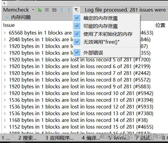 Detect Leak Types (Show Reachable) :除了记录所有确定的直接内存泄漏、间接内存泄漏到文件中,还会将可能存在内存泄漏的结果记录到文件中,可以通过过滤器中【可能的内存泄漏】选项过滤;Fuzzy