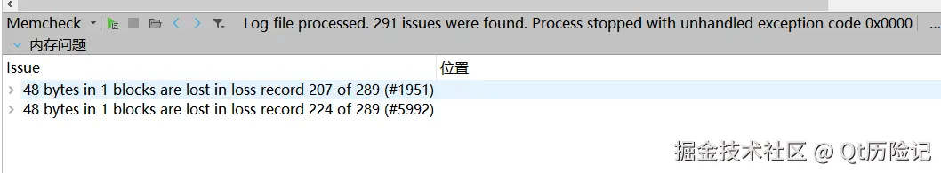 检测结果如下所示,出现两个内存泄漏,大小分别是409600字节和16字节。
