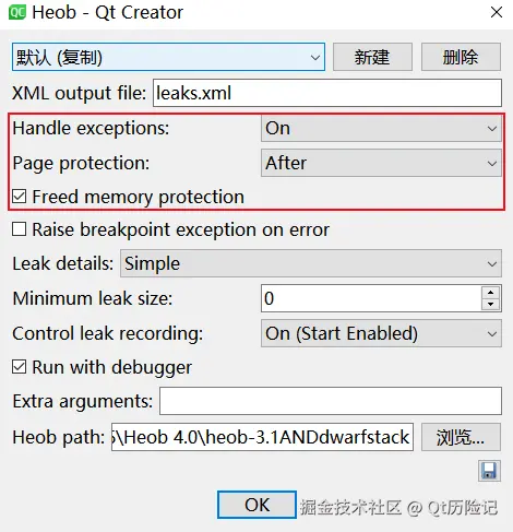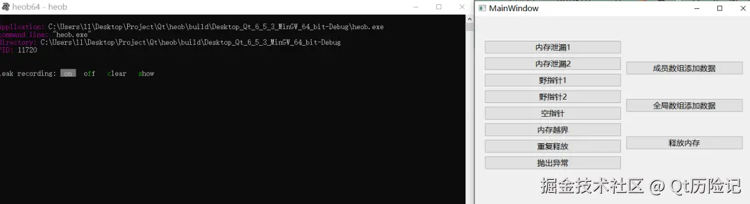 Heob是一个Windows下检测缓冲区溢出(野指针、空指针、内存越界、重复释放、异常捕获等)和内存泄漏的工具,集成到Qt Creator中,功能强大,简单容易上手。