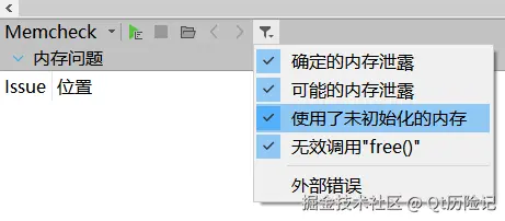 生成的检测结果会有许多动态库中的误报,可以点击调试窗口上的过滤图标,取消勾选【外部错误】项(如果MSVC版本<=2017则勾选外部错误);