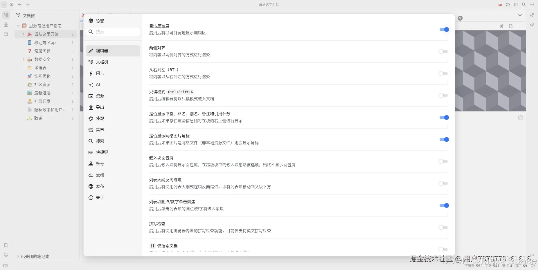 设置的配置项很多:编辑器设置、文档树、闪卡、AI、资源、导出、集市(包类似于第三方应用程序,它可以做任何它想做的事情,所以在集市中安装集市包存在一定的安全风险)、搜索选项(启用的块级类型中进行搜索、块级属性、反链提及、索引 、搜索结果显示数、区分大小写 )、快捷键、帐号、云端(可选云端存储服务提供商,选择后将使用该提供商的云端存储服务实现云端同步和备份功能)、发布(启用后将启动发布服务,该服务以只读模式在局域网中发布当前工作空间的内容)