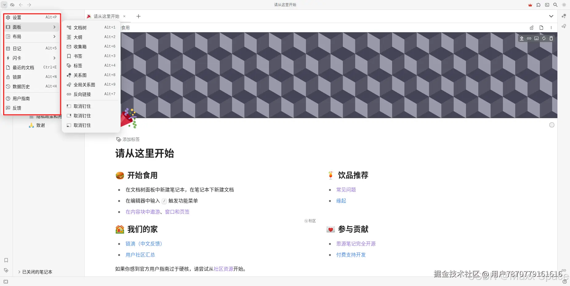 除了设置,还有面板设置、布局、日记、闪卡、最近的文档、锁屏、数据历史、用户指南等