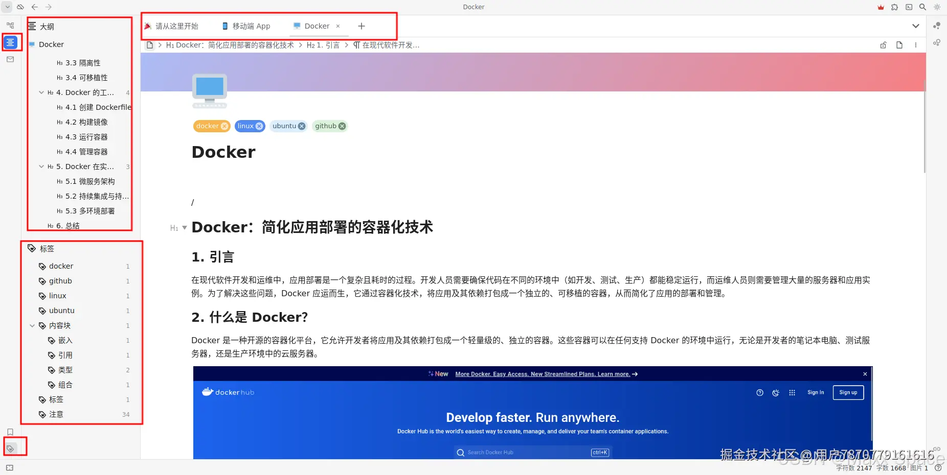 大纲列表展示目录,书签显示已经添加的书签记录,标签显示添加的标签及其关联笔记