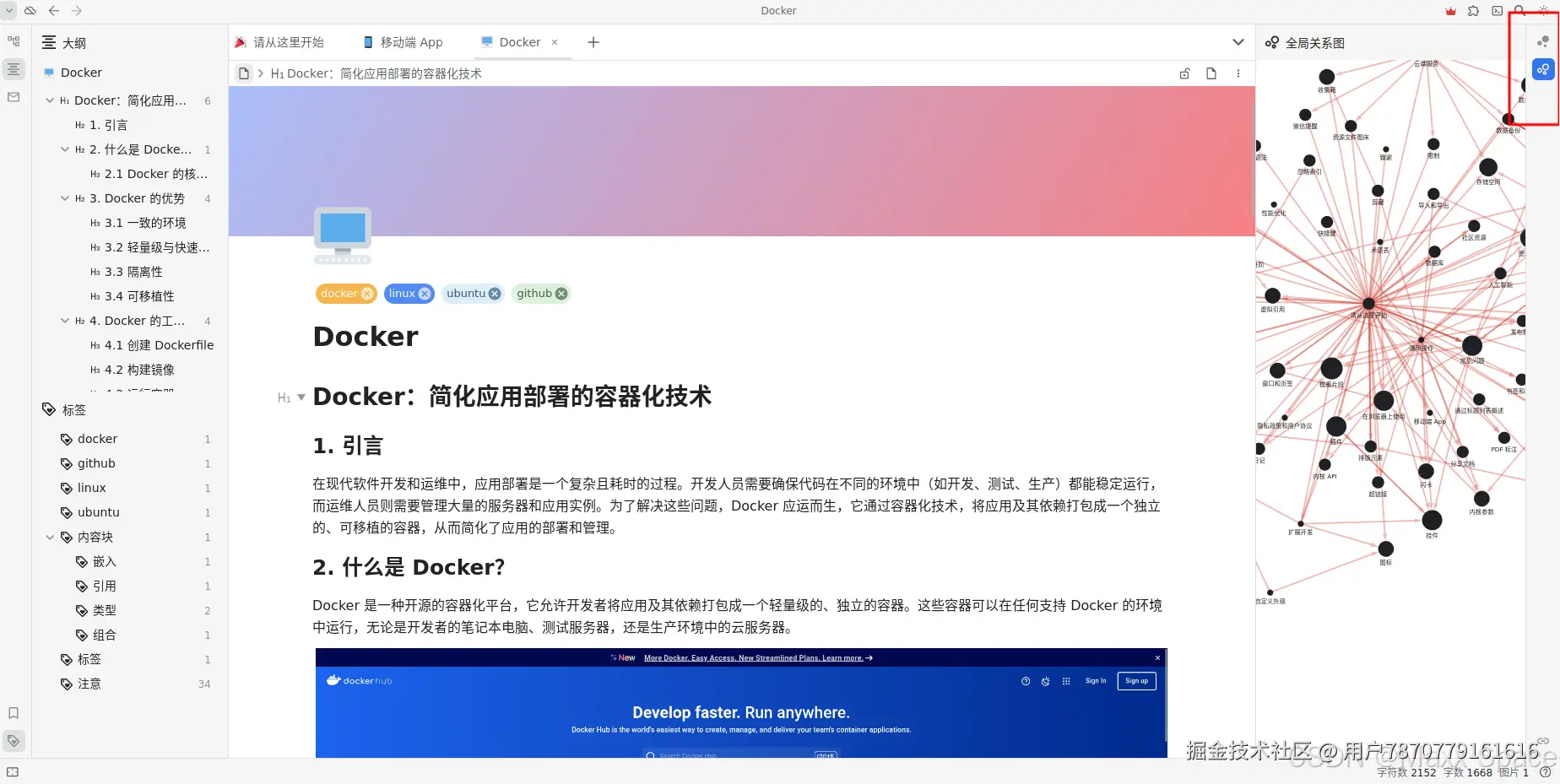 •双链块引:支持块级双向链接,将所有文档页面作为块管理。通过反向链接和链接关系图,用户可以轻松发现和可视化知识之间的关系。