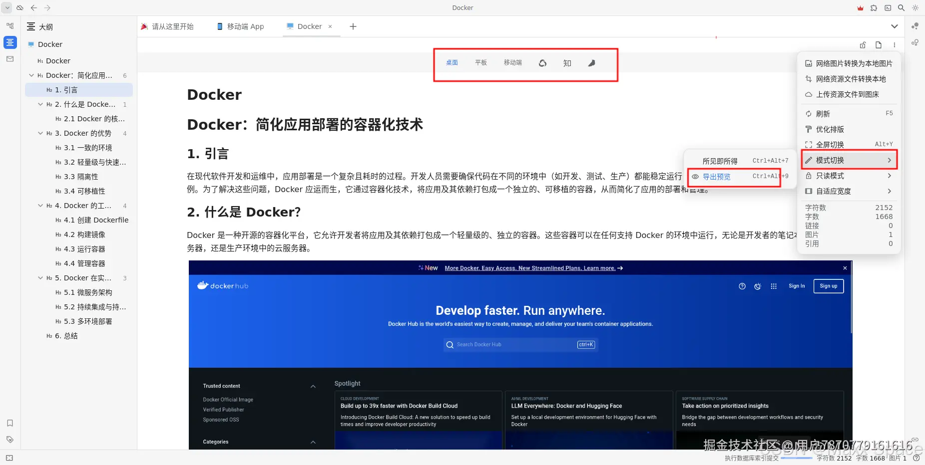 模式切换选择导出预览时候,可以切换桌面、平板、移动端,还可以一键复制到公众号、知乎和语雀