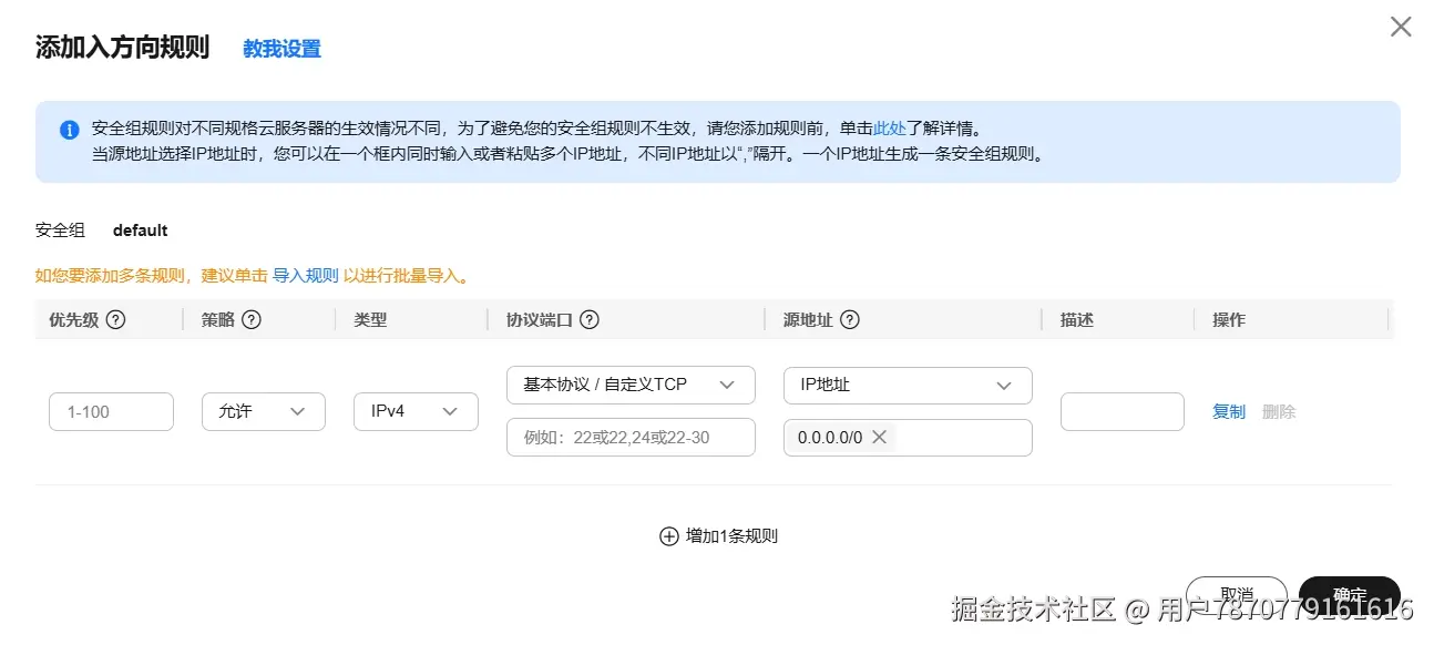 主要需要填写优先级(默认填1即可)、协议端口(协议一般为TCP或UDP,端口一般选择你项目需要暴露的端口即可),描述(选填,一般会填写此端口的用途以免忘记了),其他默认点击确定即可。安全组配置主要是暴露端口可以给外网访问。