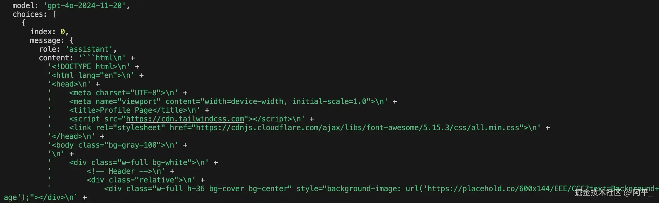可以看到,这就是一个 prompt,让大模型根据图片内容,生成对应的代码,这里的 image_url 为 base64 格式的,提供一个 HTTP 格式的 Url 也可以。