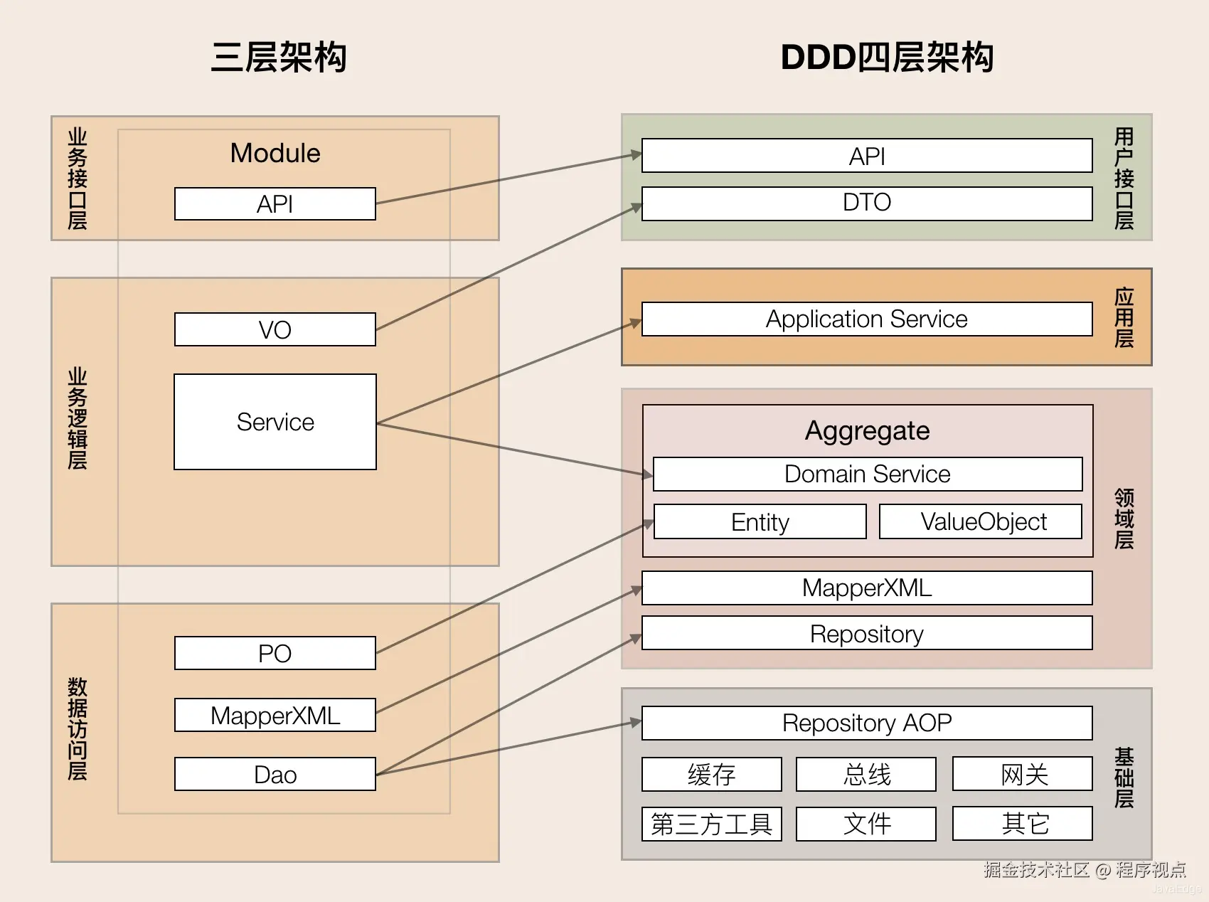 DDD分层要类似三层架构,只是在DDD中,这些要素被重新划分了层,确定了层与层之间的交互规则和职责边界。