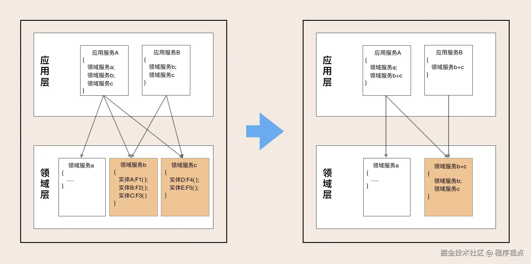 服务设计时,你并不一定能完整预测有哪些下层服务会被多少个上层服务组装,因此领域层通常只提供一些原子服务,比如领域服务a、b、c。但随系统功能增强和外部接入越来越多,应用服务不断丰富。终有一日,你会发现领域服务b和c同时多次被多个应用服务调用了,执行顺序也基本一致。这时你可以考虑将b和c合并,再将应用服务中b、c的功能下沉到领域层,演进为新的领域服务(b+c)。这样既减少了服务的数量,也减轻了上层服务组合和编排的复杂度。